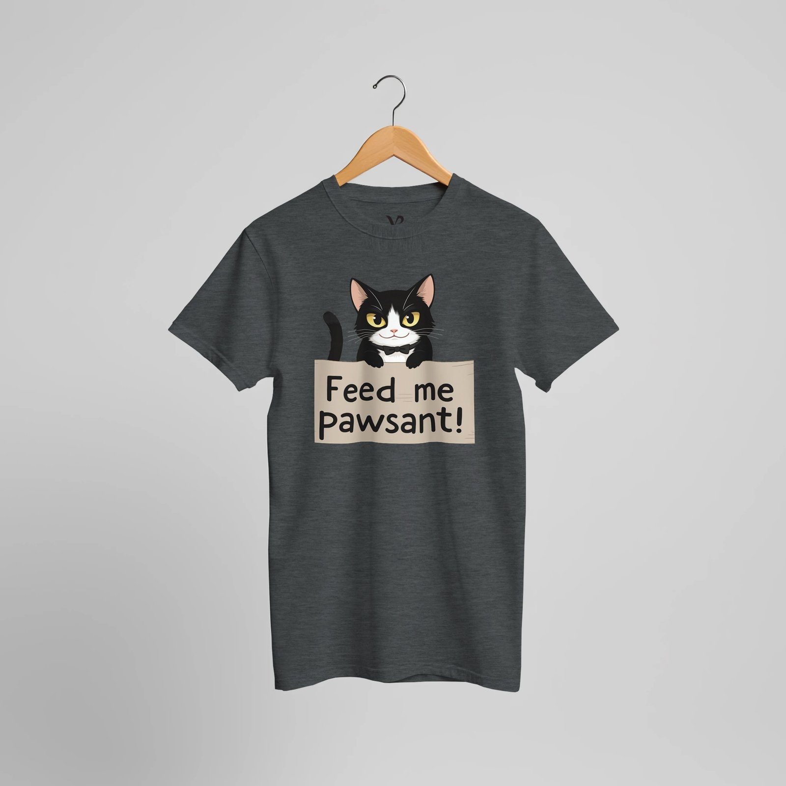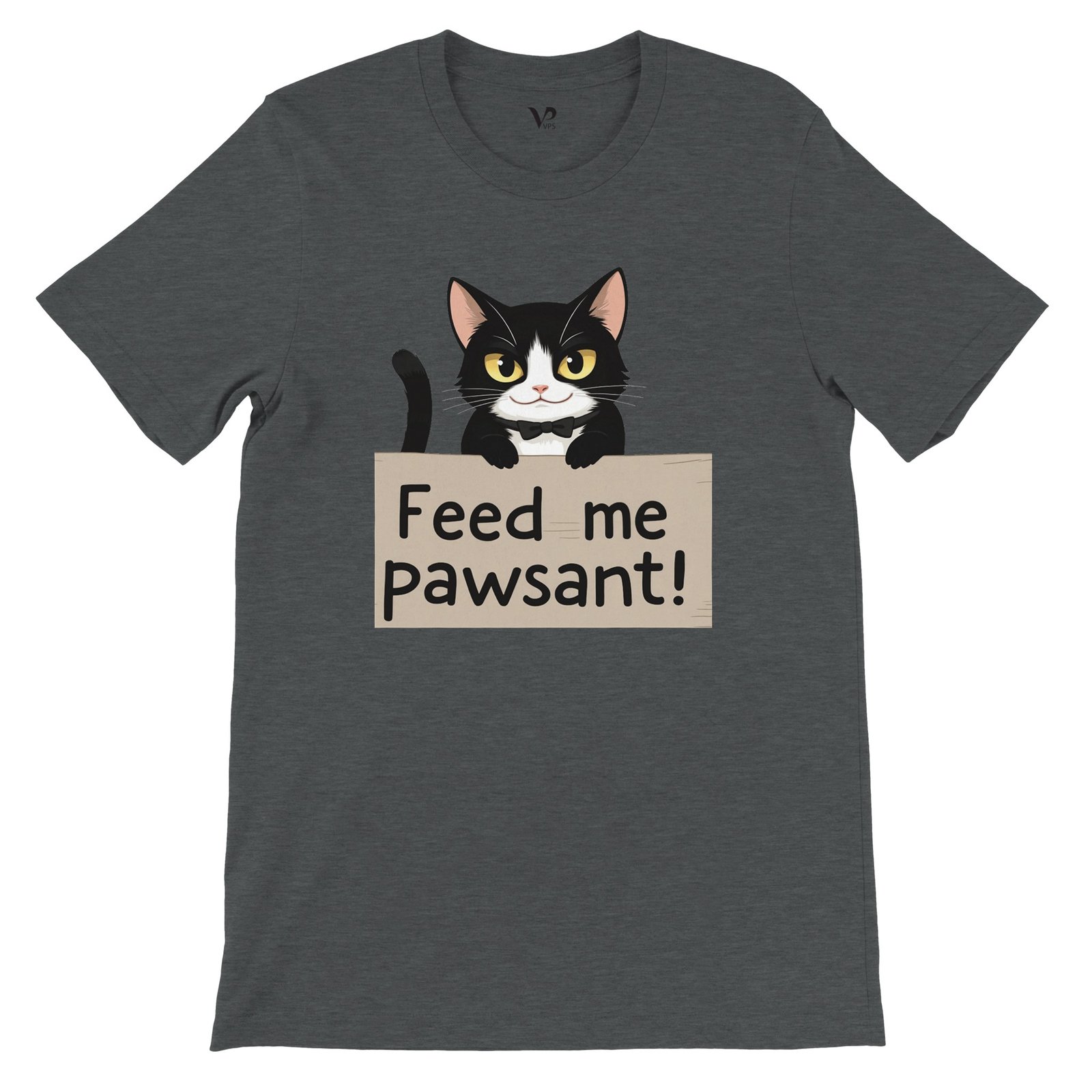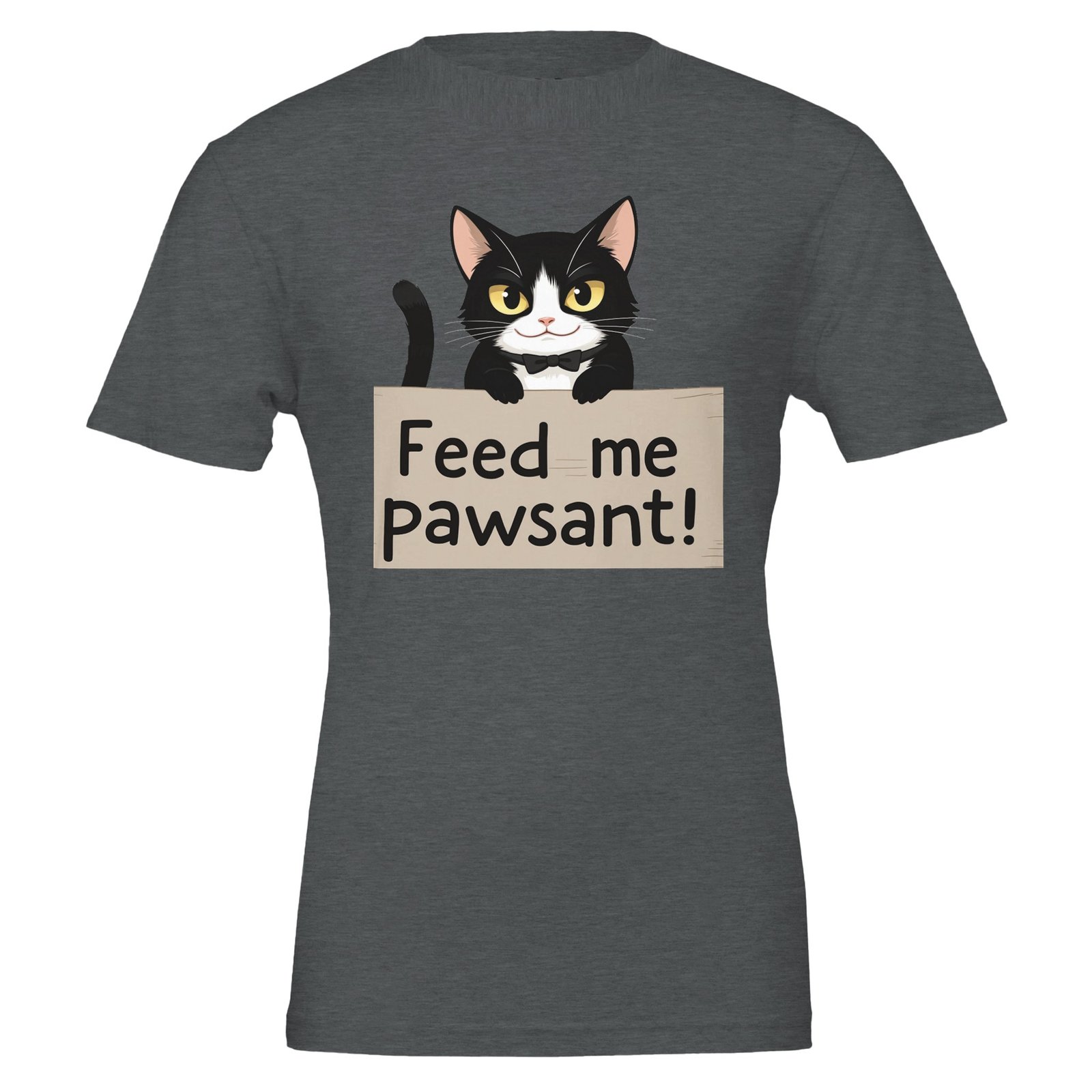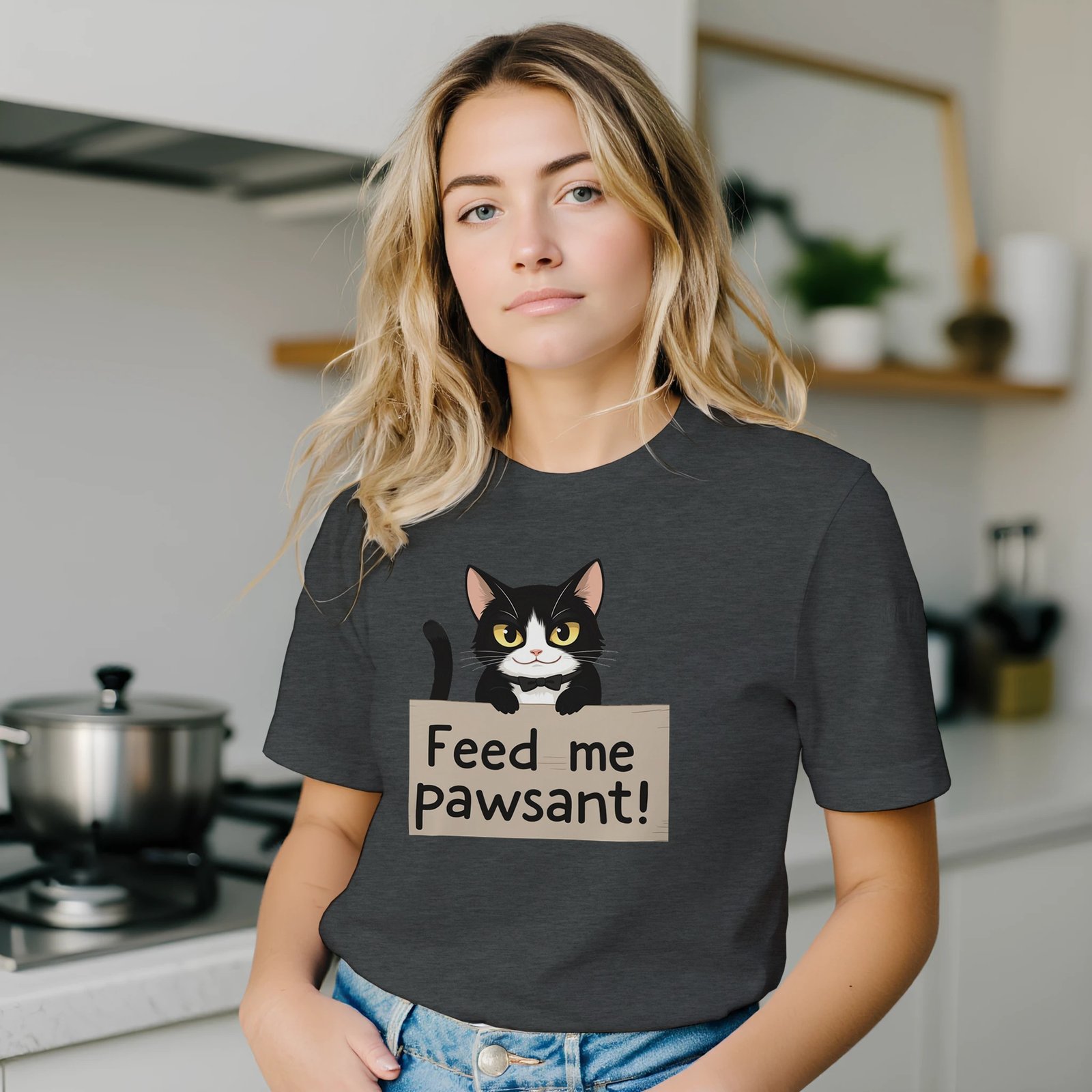 Unleash your sense of humor with our Funny Cat T-Shirt, featuring an adorable feline holding a sign that says ‘Feed Me’, with a clever twist on the word ‘peasant’—it’s ‘pawsant’! This whimsical design is perfect for cat lovers and anyone who enjoys a good laugh.