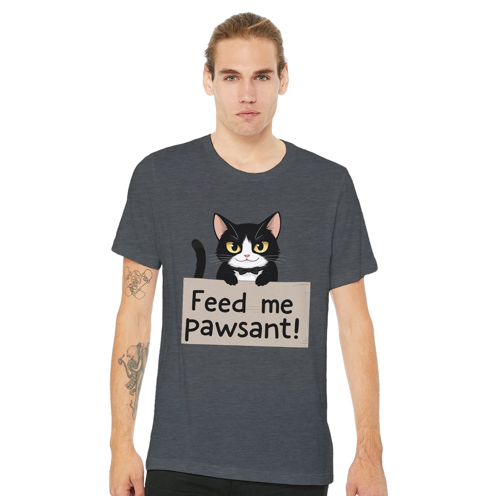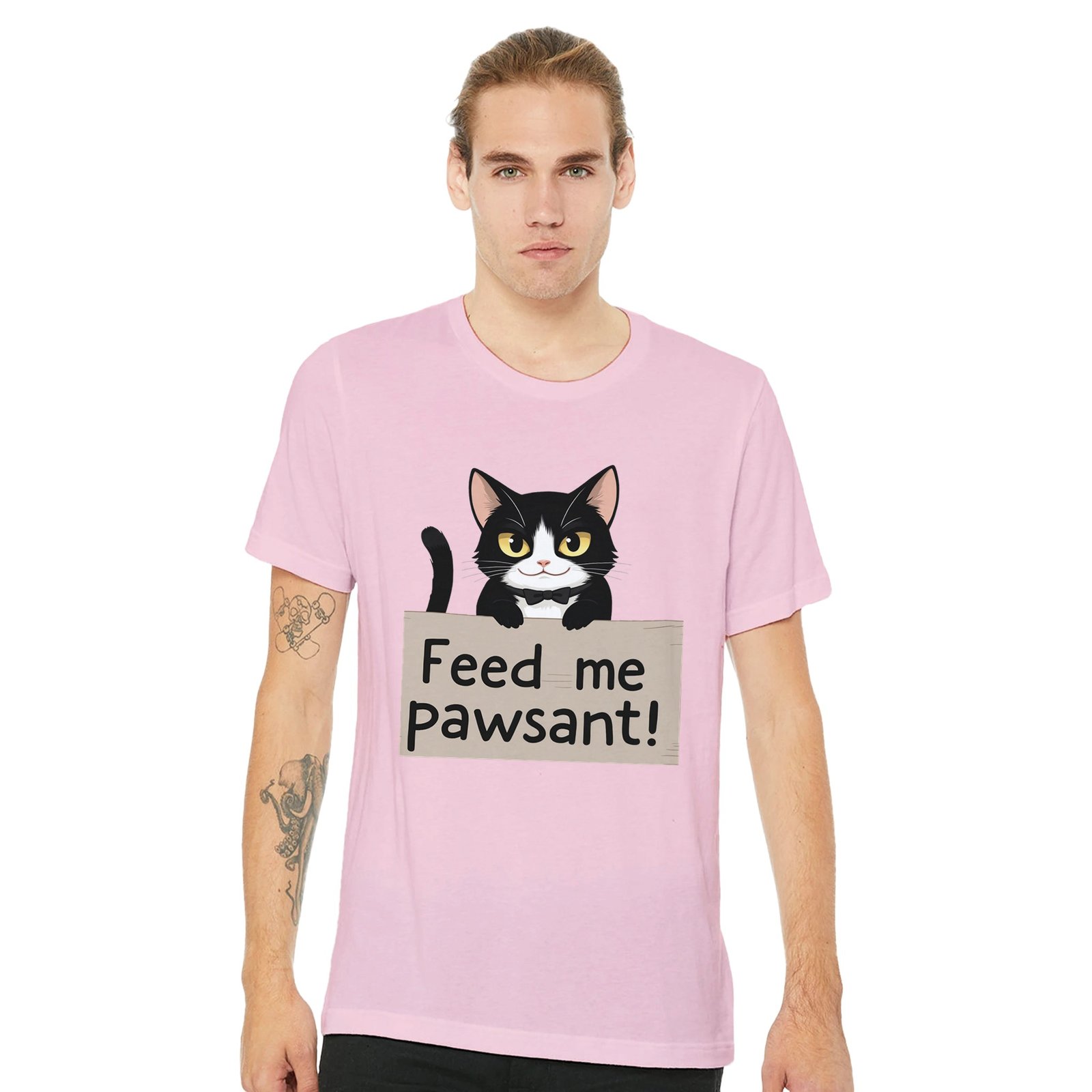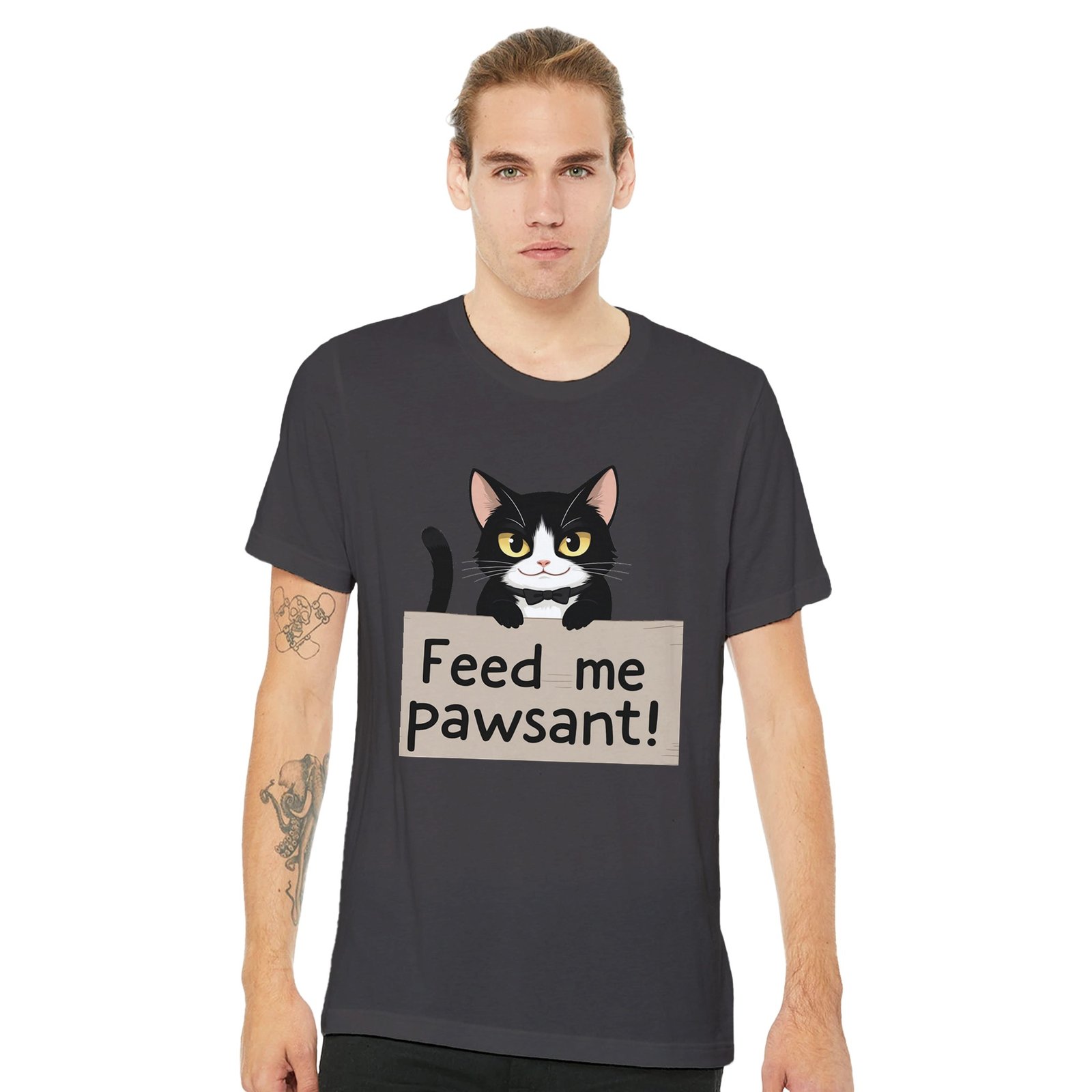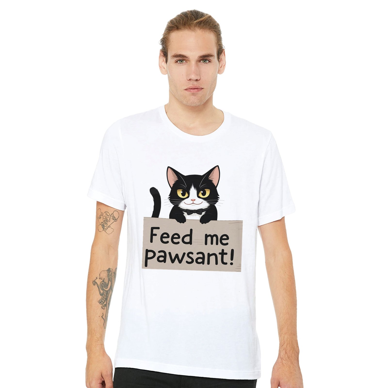Unleash your sense of humor with our Funny Cat T-Shirt, featuring an adorable feline holding a sign that says ‘Feed Me’, with a clever twist on the word ‘peasant’—it’s ‘pawsant’! This whimsical design is perfect for cat lovers and anyone who enjoys a good laugh.