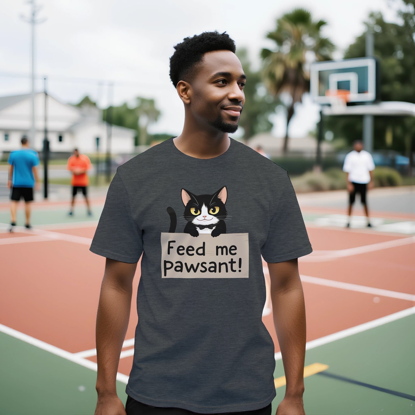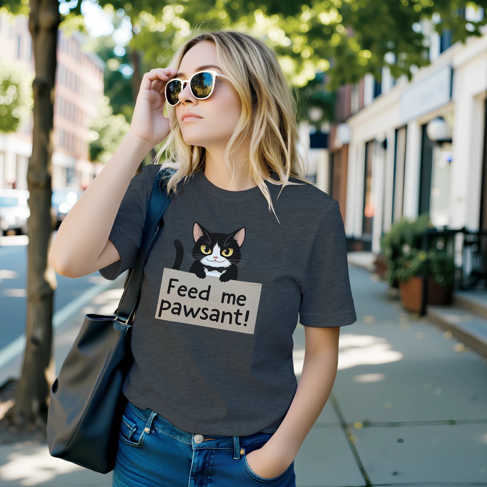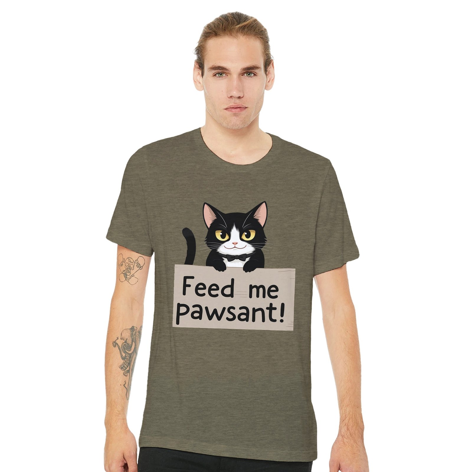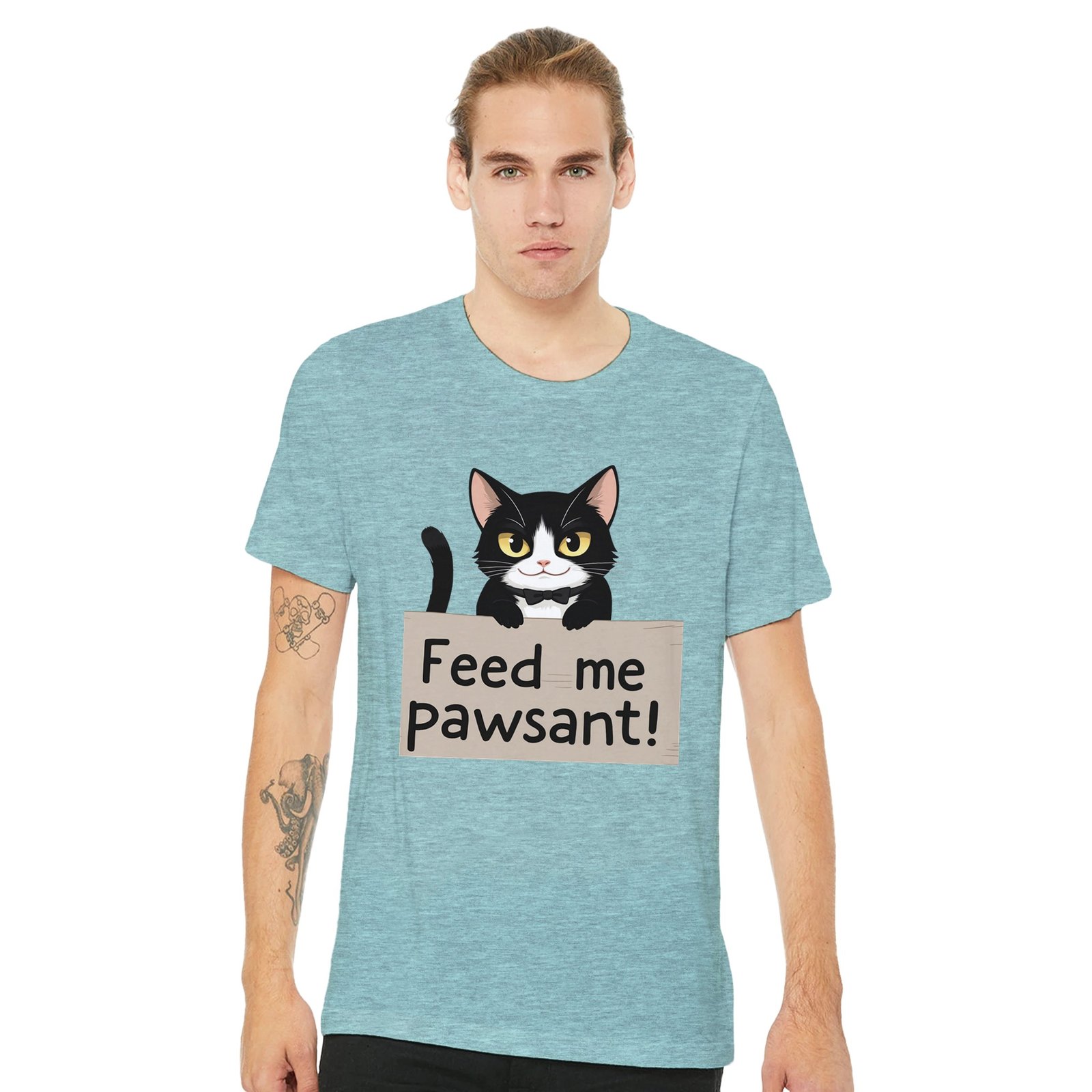 Unleash your sense of humor with our Funny Cat T-Shirt, featuring an adorable feline holding a sign that says ‘Feed Me’, with a clever twist on the word ‘peasant’—it’s ‘pawsant’! This whimsical design is perfect for cat lovers and anyone who enjoys a good laugh.